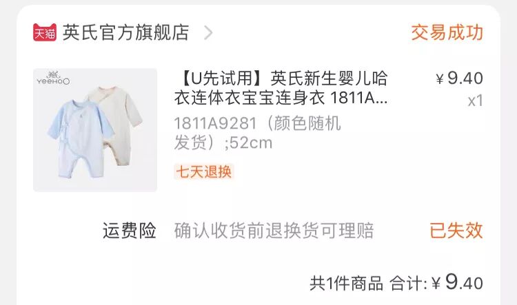 有一次我花9.4元领到了一件英氏价值158的连体服我觉得还蛮划算的呢~