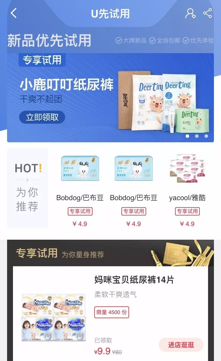 在这个版块里面有某些大牌的小样,可以9.9元抢到,像我最近经常逛母婴用品,所以马爸爸经常会给我推送纸尿裤婴儿服装什么的,我也领了很多。