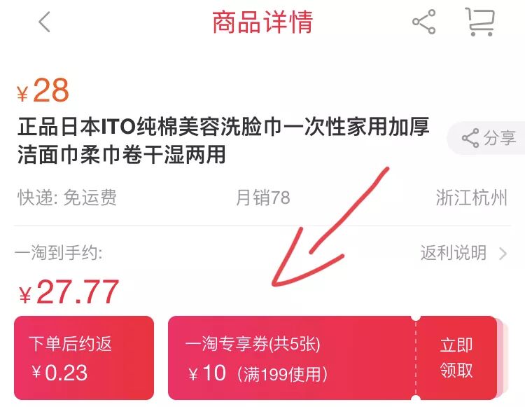 这里有个小提示,在一淘的购物车进行结算的时候,记得用点进去商品详情看一下,有时候店铺会有隐藏优惠券,在淘宝网端是不会显示的,但是一淘端就这里会显示出来,我的特仑苏牛奶、多芬磨砂膏都是在这里领的隐藏优惠券!(动动手指头又省好几十块钱,意不意外,开不开心?)